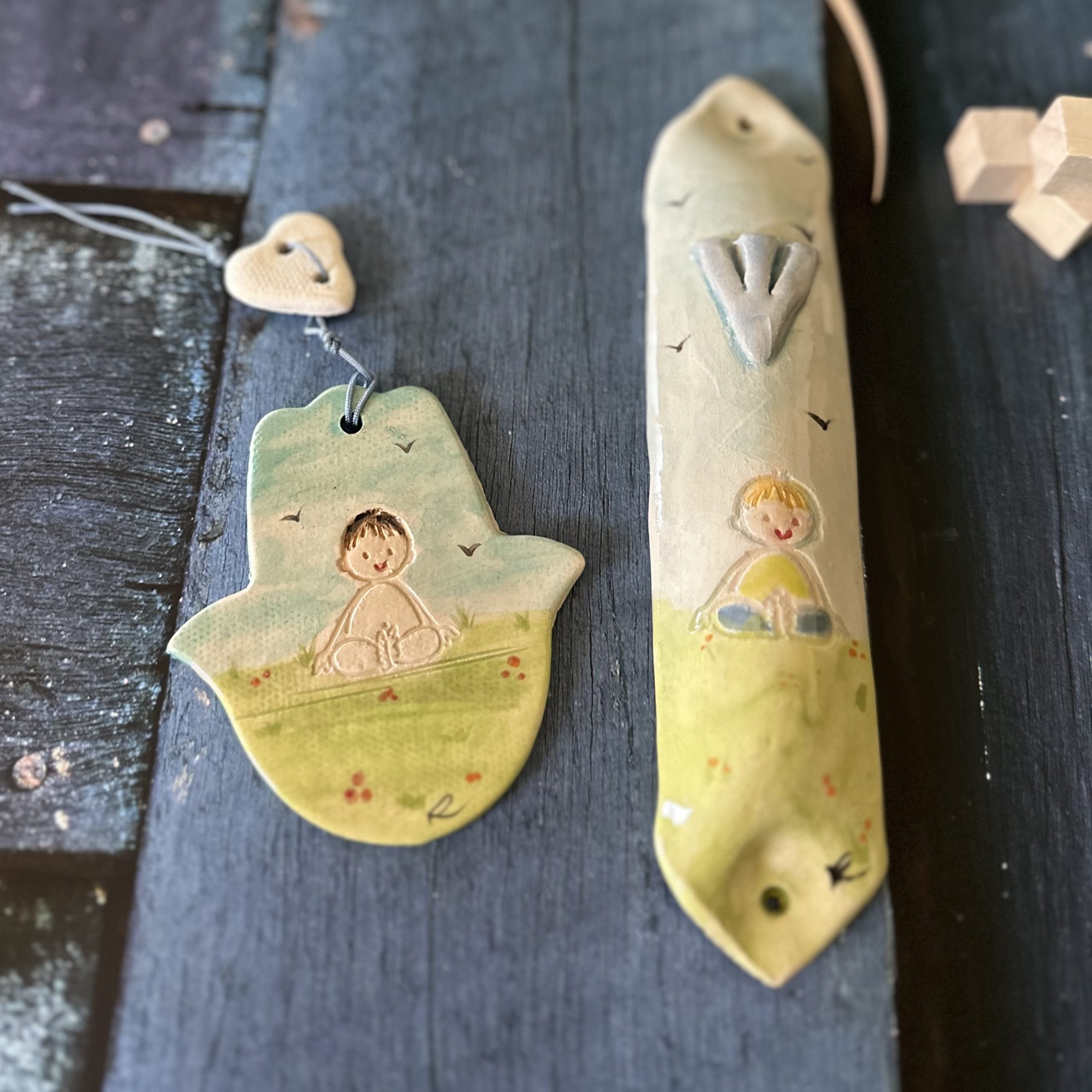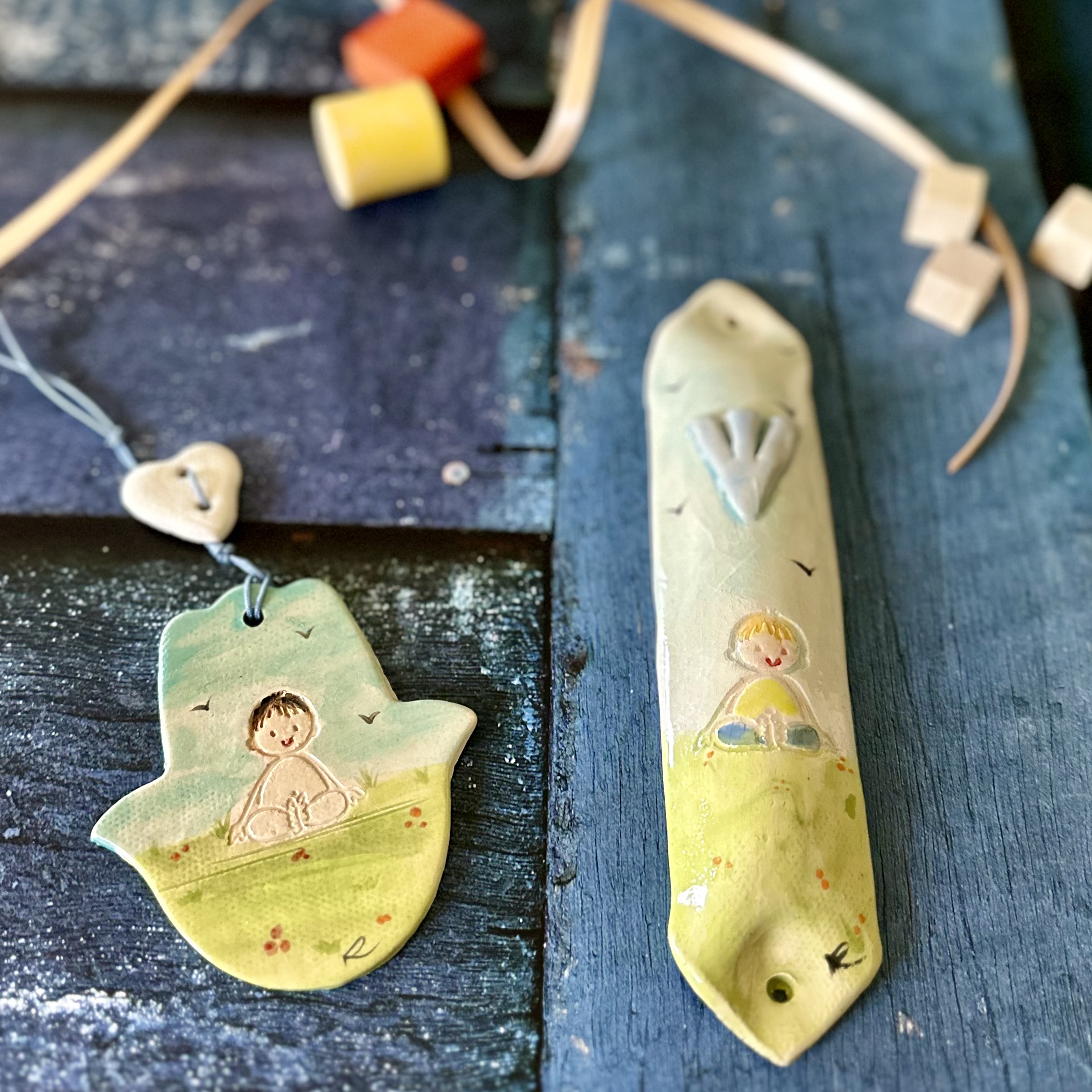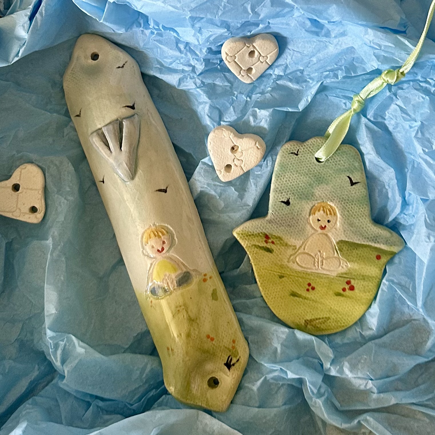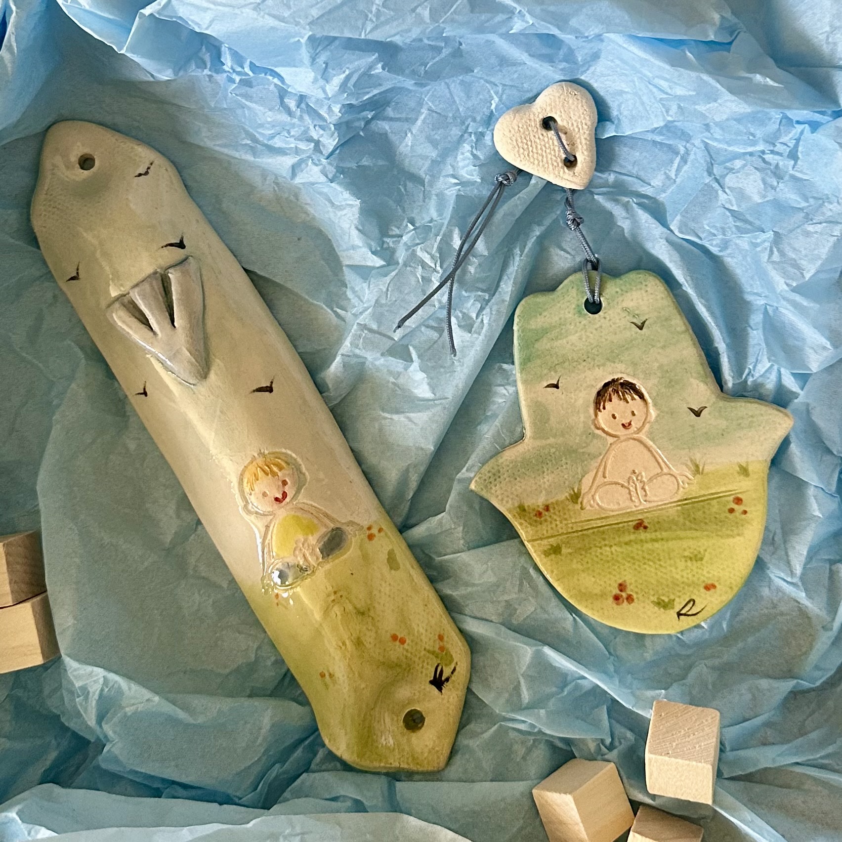 סט חמסה ומזוזות קרמי בעבודת יד זה הוא תוספת מקסימה ומשמעותית לכל חדר ילדים. סט יודאיקה זה, המצויר ביד, נוצר בקפידה בסטודיו שלי בנגב, וכולל איור מקסים של ילדה מתוקה המביאה חום, שמחה והגנה לחדר הילדים שלכם.