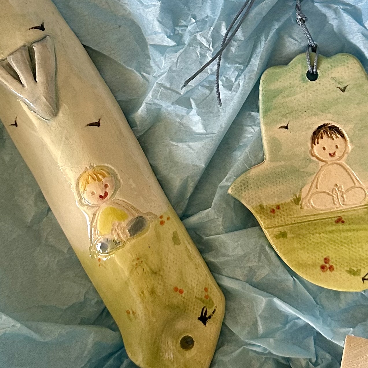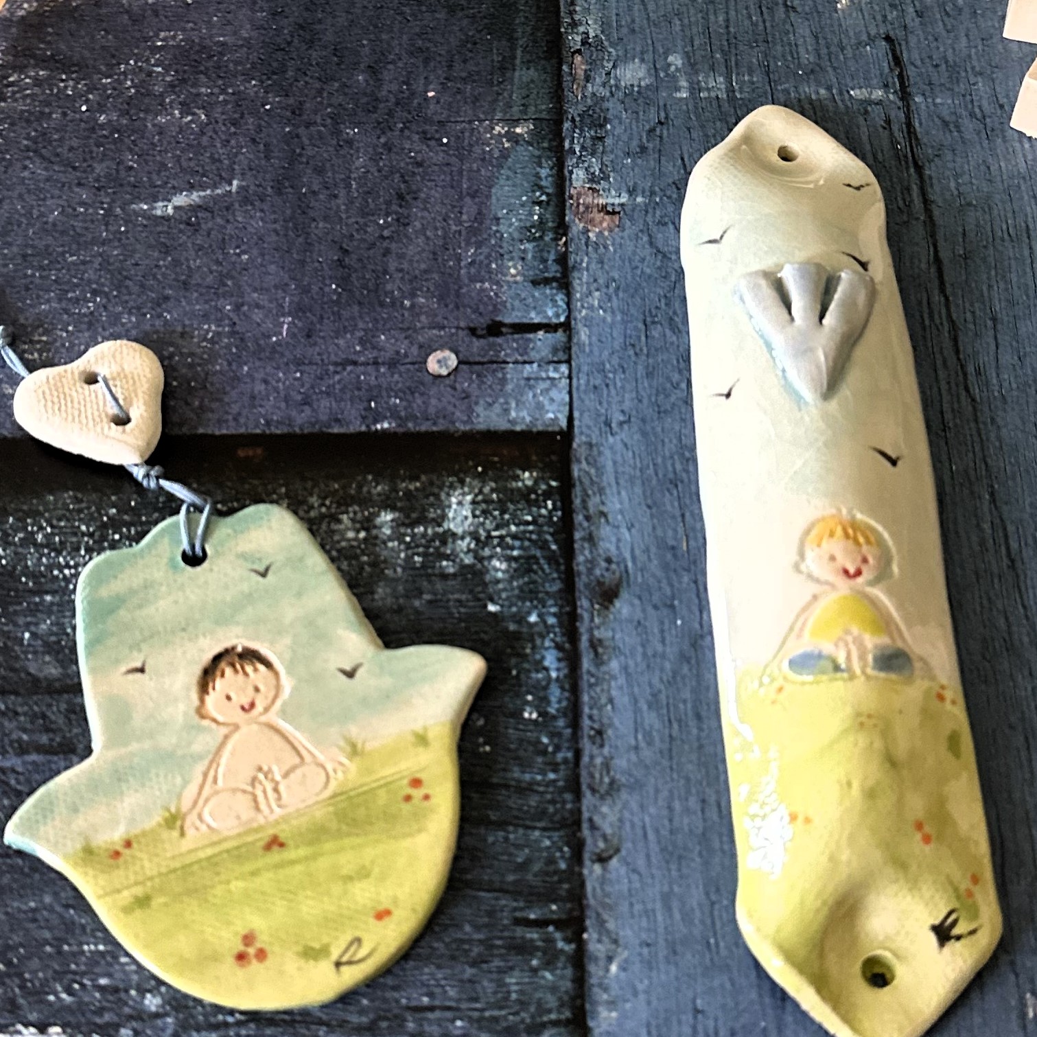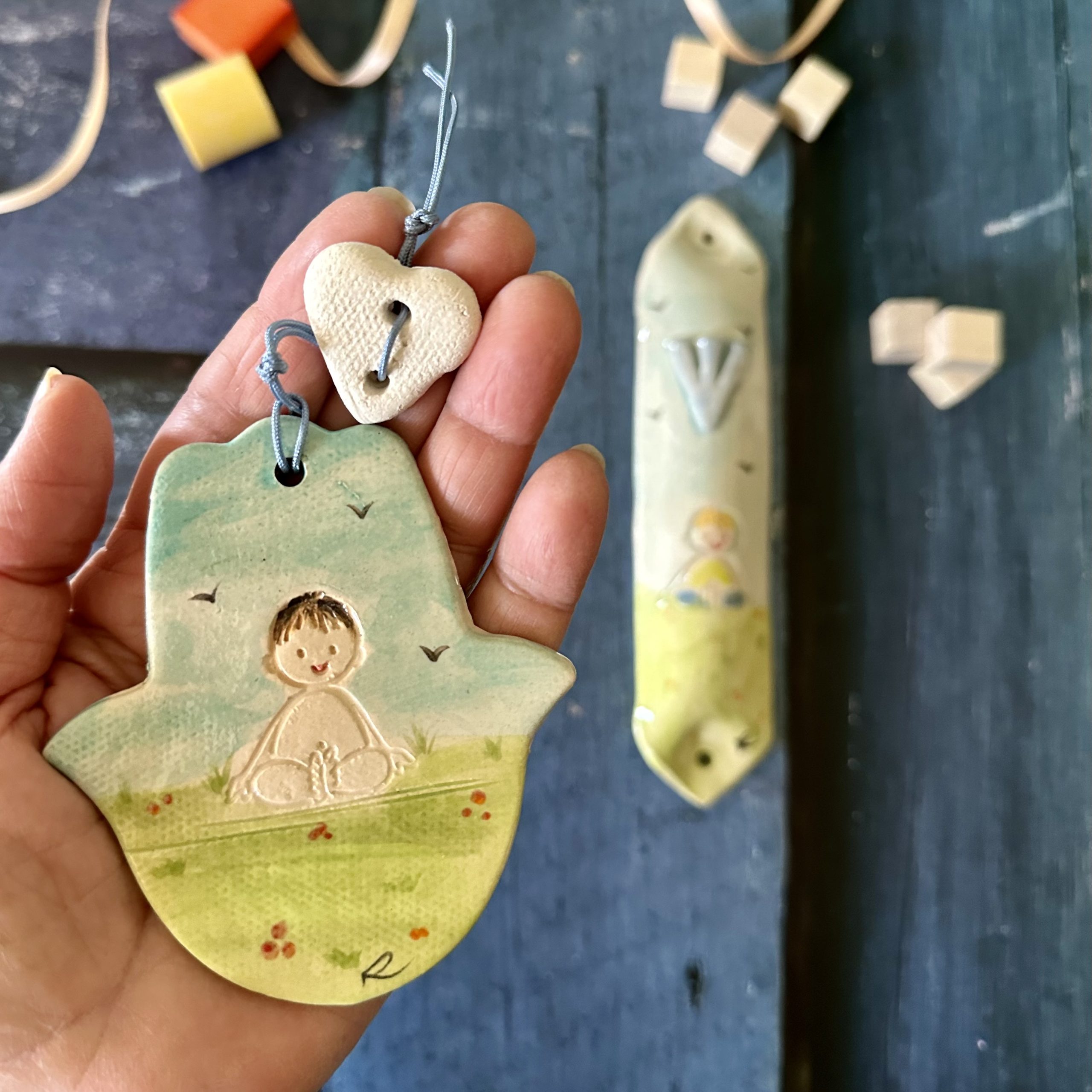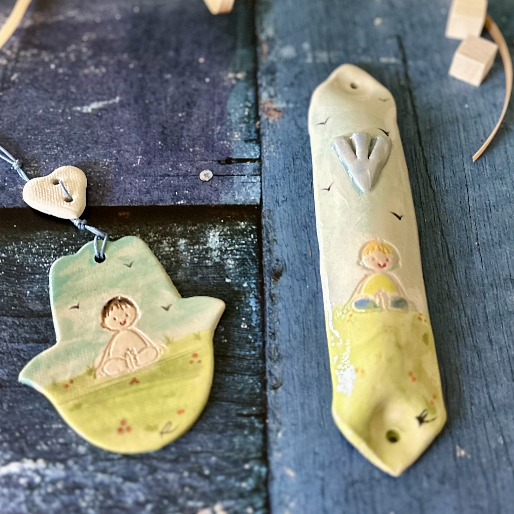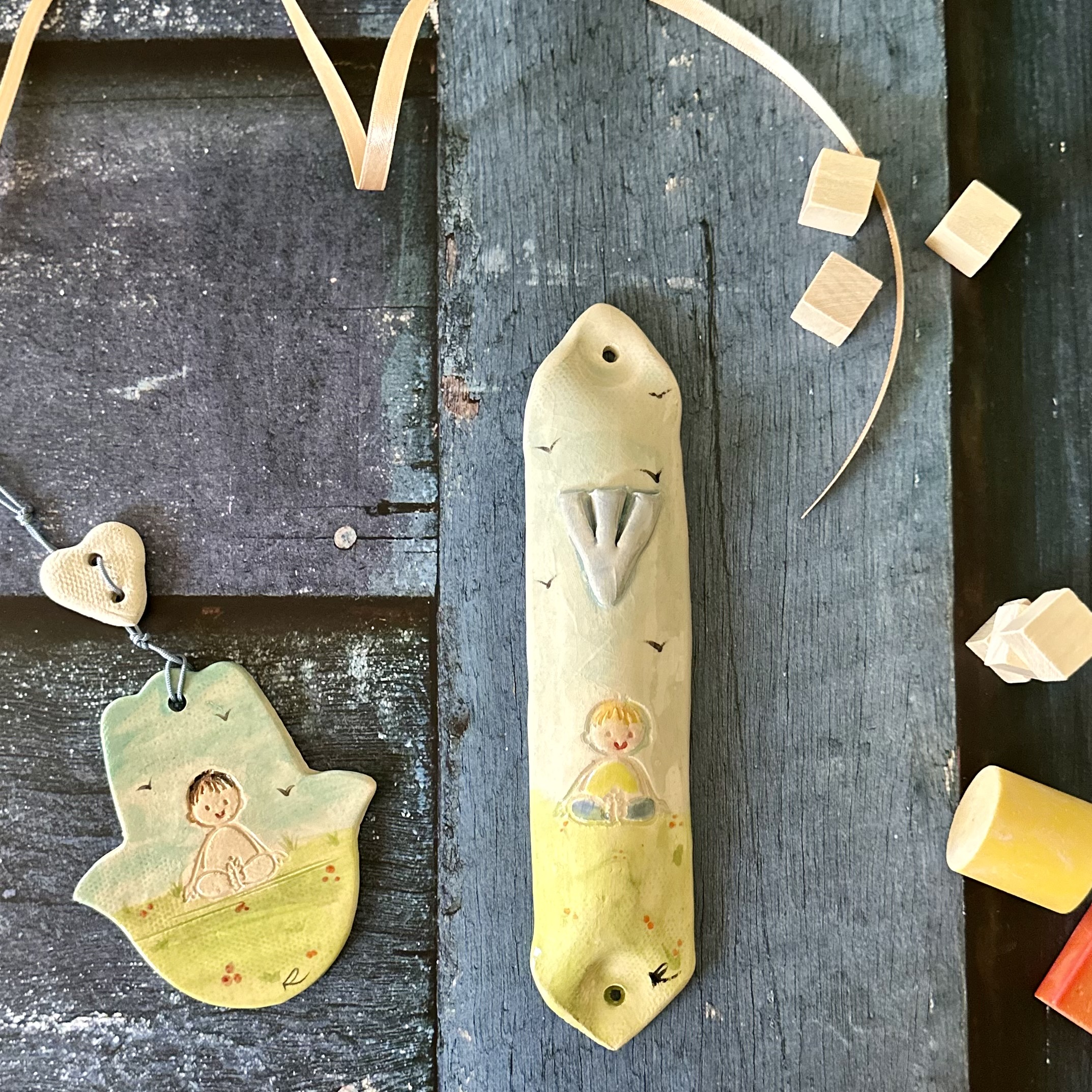 סט חמסה ומזוזות קרמי בעבודת יד זה הוא תוספת מקסימה ומשמעותית לכל חדר ילדים. סט יודאיקה זה, המצויר ביד, נוצר בקפידה בסטודיו שלי בנגב, וכולל איור מקסים של ילדה מתוקה המביאה חום, שמחה והגנה לחדר הילדים שלכם.